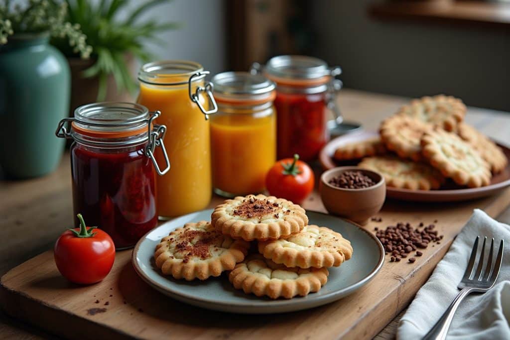 - Herzhafte Leckereien: Chutneys, Dips, Aufstriche, eingelegtes Gemüse, Kräuteröle, Gewürzmischungen, Pesto, selbstgemachtes Brot, Cracker, Grissini.